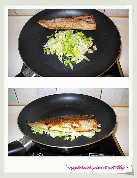 4.將魚肉覆蓋至蔥蒜上,再稍煎一會
